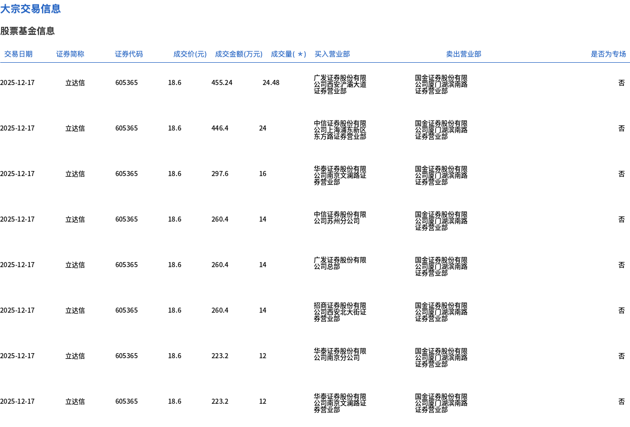 12月17日,立达信大宗交易成交130.48万股,成交额2426.84万元,占当日总成交额的6.11%,成交价18.6元,较市场收盘价22元折价15.45%。