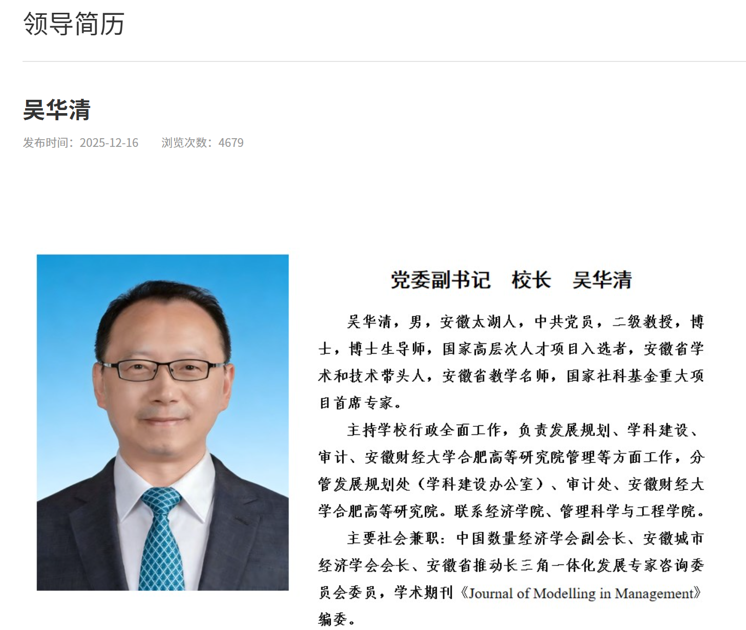 据安徽财经大学官网更新显示:吴华清已任安徽财经大学党委副书记、校长,主持学校行政全面工作,负责发展规划、学科建设、审计、安徽财经大学合肥高等研究院管理等方面工作,分管发展规划处(学科建设办公室)、审计处、安徽财经大学合肥高等研究院。联系经济学院、管理科学与工程学院。