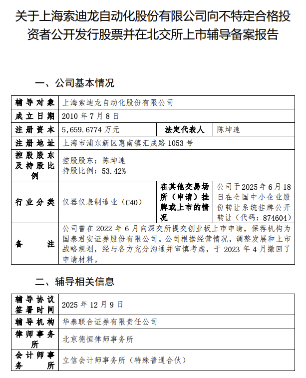 12月19日,证监会网站披露,上海索迪龙自动化股份有限公司启动上市辅导,拟在北交所上市,辅导机构为华泰联合证券。山东尚正新材料科技股份有限公司启动上市辅导,拟在创业板上市,辅导机构为中泰证券。
