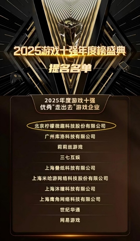 12月3日,中国游戏产业的年度风向标——“2025年度游戏十强”提名名单正式揭晓。凭借在海外市场的亮眼表现,柠檬微趣、莉莉丝、米哈游等十家知名企业入围“2025年度游戏十强优秀‘走出去’游戏企业”提名。