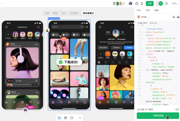 当设计进入交付阶段,墨刀设计的D2C设计稿转代码能力进一步延展了变量的价值。UI设计中定义的变量结构,在交付过程中可以保持清晰的逻辑关系,帮助设计意图更准确地传递给开发侧,减少设计与代码之间的理解偏差。在这一过程中,变量作为设计与开发之间的共同语言,提高交付过程的稳定性和一致性。