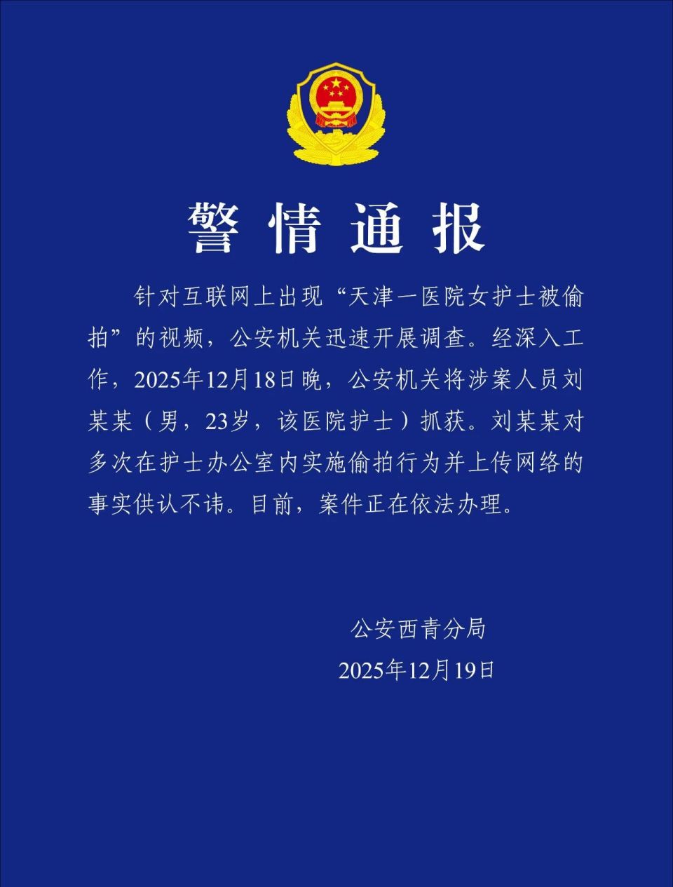 天津市公安局西青分局通报,针对互联网上出现“天津一医院女护士被偷拍”的视频,公安机关迅速开展调查。经深入工作,12月18日晚,公安机关将涉案人员刘某某(男,23岁,该医院护士)抓获。刘某某对多次在护士办公室内实施偷拍行为并上传网络的事实供认不讳。目前,案件正在依法办理。