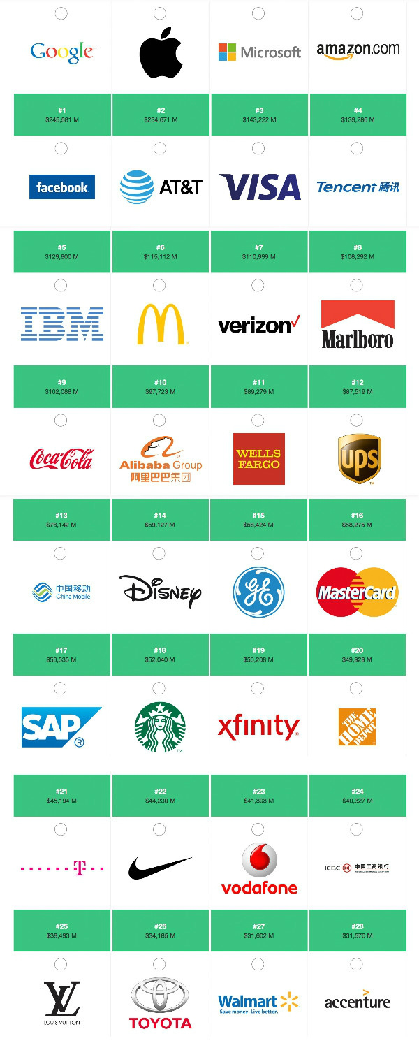 排名前十的品牌分别为谷歌、苹果、微软、亚马逊、Facebook、AT&T、VISA、腾讯、IBM和麦当劳。