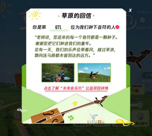 这种模式的成功,依托于穿越火线手游公益实践的创新。它将游戏从娱乐体验转变为凝聚爱心和传承文化的平台,依托玩家群体的力量实现对公益方式和公益实效的改变:玩家登录游戏参与“一元助力乡村音乐启蒙计划”,游戏则向玩家回赠活动定制马头琴背饰,这让传统文化在当代生活中焕发出鲜活的生命力,与年轻一代自然共鸣。参与活动的玩家还会收到“来自草原的回信”。