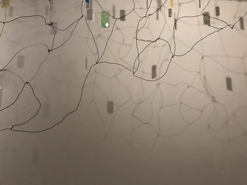 展厅中最大的一件装置《Indra and Amulets》(2016-2017),是用黄色、红色、蓝色、绿色、白色五种颜色的电线编织而成的,代表金木水火土五种元素。在这张错综复杂的网络上,绑着许许多多和智能手机屏幕相似的物件。南希潮在这些“屏幕”上绘制了各种图案——老虎、石头、眼睛等符号。这件作品阐释了《当代萨满》中的“当代”二字。我们如今生活的时代,各种信息流顺着一张看不见的网络爬行、传递、蔓延。这件作品是网络的具体化,在其中没有具体的人,有的只是一个个轻薄的、扁平化的电子屏幕,上面的符号是信息时代的图腾。它们不像原始社会的图腾那样规定着乱伦禁忌,但却以一种新的方式规范着网络社会的交往原则。点赞、emoji,这些图标化的符号早已取代语言,成为了信息时代的全新标识。