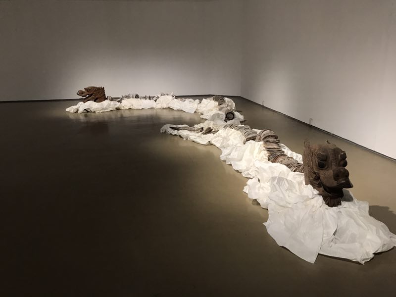 在《云顶祥龙》(2017)里,南希潮把废弃的碟子用电线连接起来,制成龙的身体;把她在乡下寺庙中购得的木质龙头经过加工打磨,做成龙头;最后,她用自制的手工纸代表祥云,托起龙身。在韩国传统文化中,龙具备呼风唤雨的能力。而祥龙在这里,则意味着农耕时期的人们对于雨水的渴求以及对于龙具有的求雨能力的仰慕。