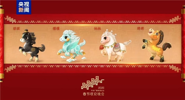 同日,中央广播电视总台《2026年春节联欢晚会》发布吉祥物形象。“骐骐”“骥骥”“驰驰”“骋骋”四匹骏马,活泼可爱、意气风发,与晚会主题“骐骥驰骋 势不可挡”一脉相承、相得益彰。吉祥物的设计灵感来源于中国不同时期马的经典形象,并将流云纹、山云纹等千年纹样“穿”上身,充盈着生生不息的历史美感和万象更新的时代气象,饱含马到成功、前程似锦的美好寓意。