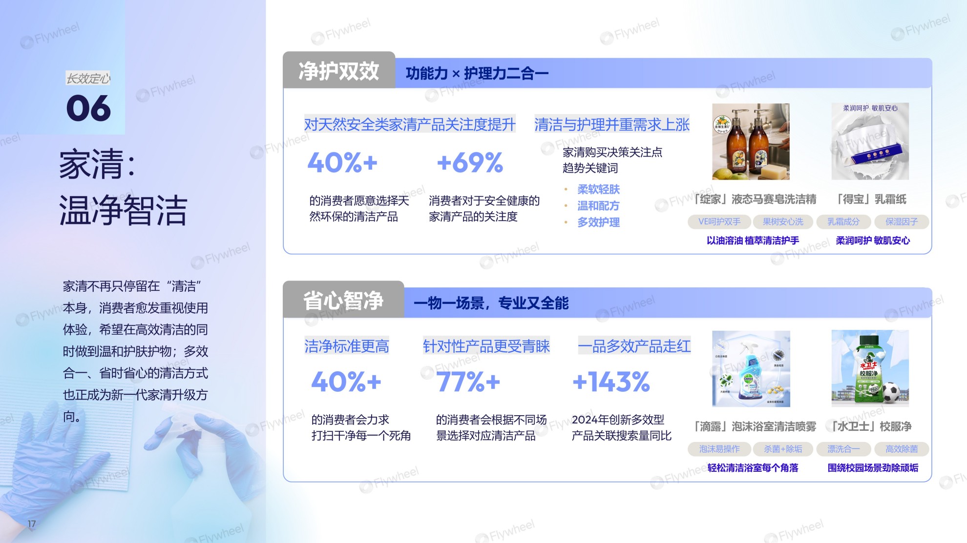 亮眼数据:在家清领域,消费者对天然安全与科学护理的关注显著提升,超过40%的消费者倾向于选择天然环保配方,对安全健康产品的整体关注度大幅增长69%。