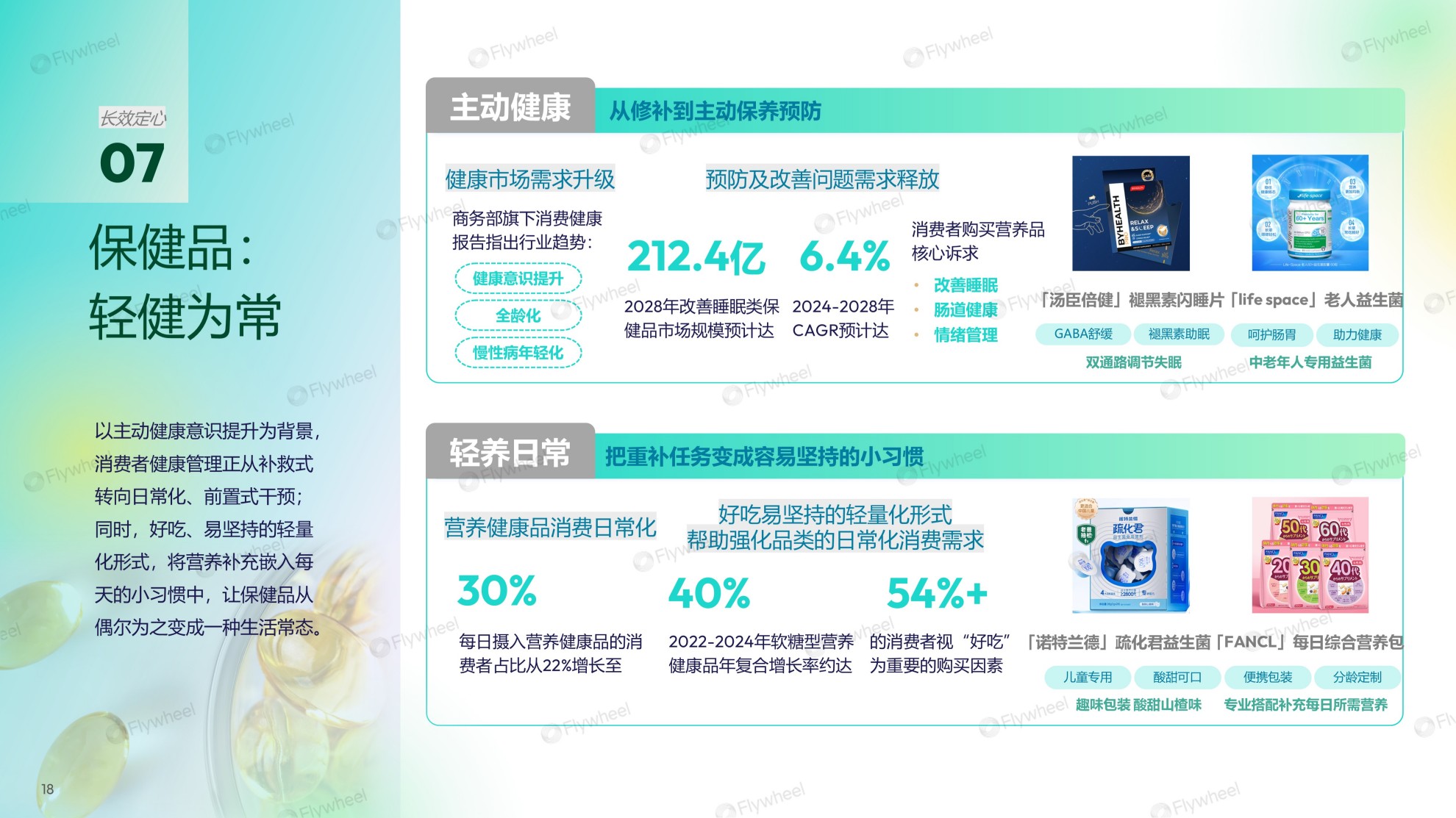 亮眼数据:消费者健康需求全面升级,预计2028年改善睡眠类保健品的市场规模将达到212.4亿元,2024-2028年复合增长率预计为6.4%,购买营养品的核心诉求集中于改善睡眠、肠道健康和情绪管理。