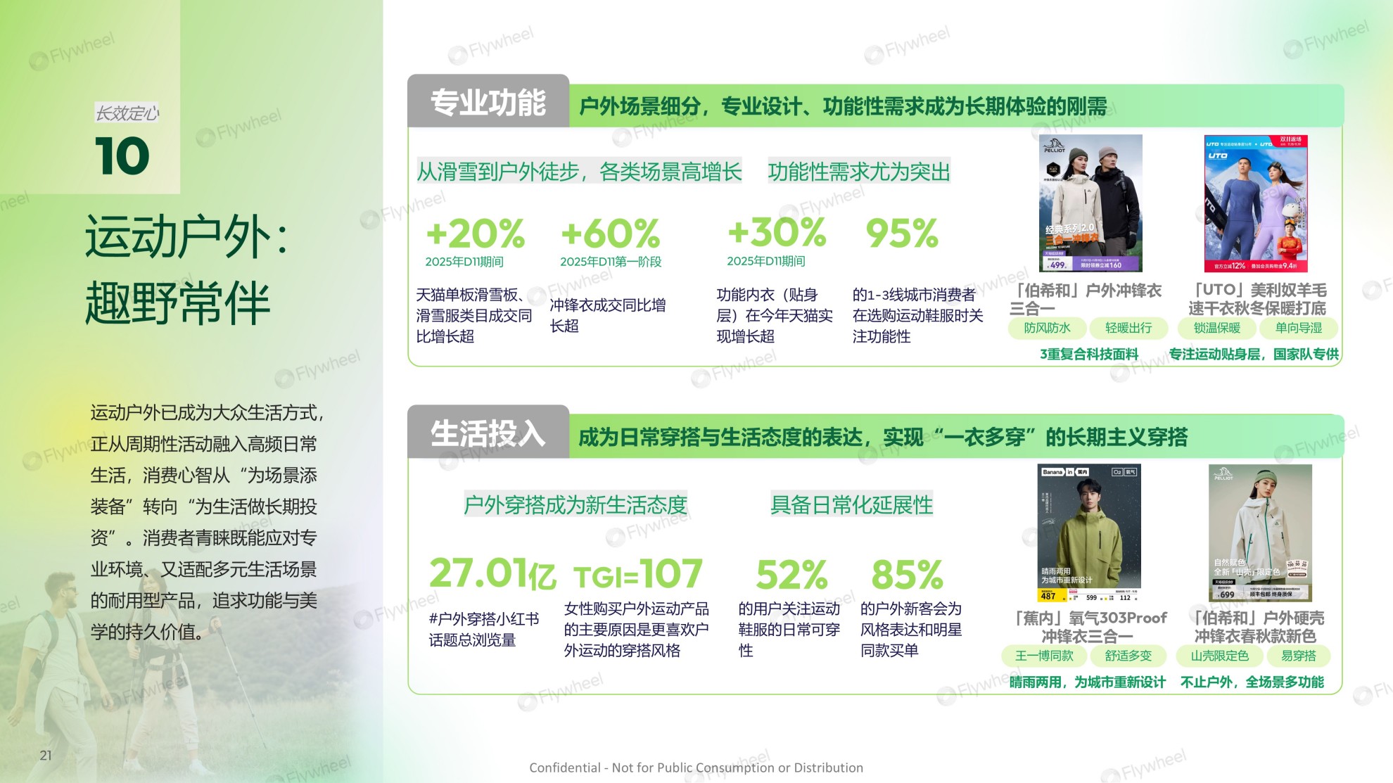 亮眼数据:专业功能与日常审美正共同驱动户外消费增长。一方面,专业功能需求持续释放,2025年双十一期间天猫平台单板滑雪、滑雪服饰类目成交同比增长超20%,冲锋衣成交同比增长超60%,功能内衣(贴身层)增长超30%,超过95%的1-3线城市消费者选购运动鞋服时关注功能性。