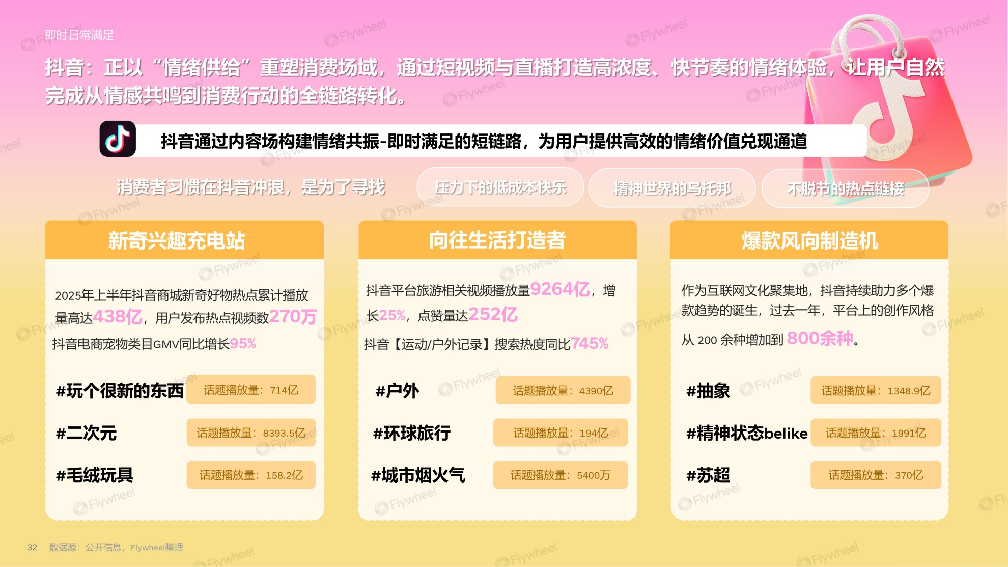 基于对消费心理与平台动向的深度洞察,Flywheel飞未发布《2025年电商消费趋势年度报告》,从“情绪快充”与“长效定心”两大关键词出发,系统梳理十大消费品类的新趋势图谱,并解析主流平台在内容场、货架场与即时履约侧的布局逻辑,帮助品牌在复杂市场中精准捕捉用户需求,实现“短期有爆点,长期有根基”的韧性增长,为2026年的战略布局提供可落地的参考指引。