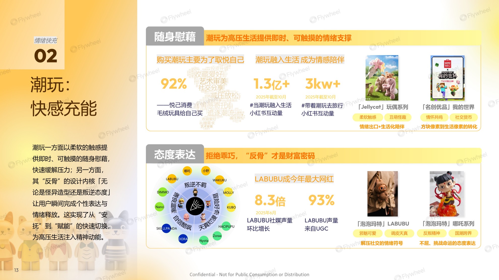 潮玩一方面以柔软的触感提供即时、可触摸的随身慰藉,快速缓解压力;另一方面,其“反骨”的设计内核「无论是怪异造型还是叛逆态度」让用户瞬间完成个性表达与情绪释放。这实现了从“安抚”到“赋能”的快速切换,为高压生活注入精神动能。