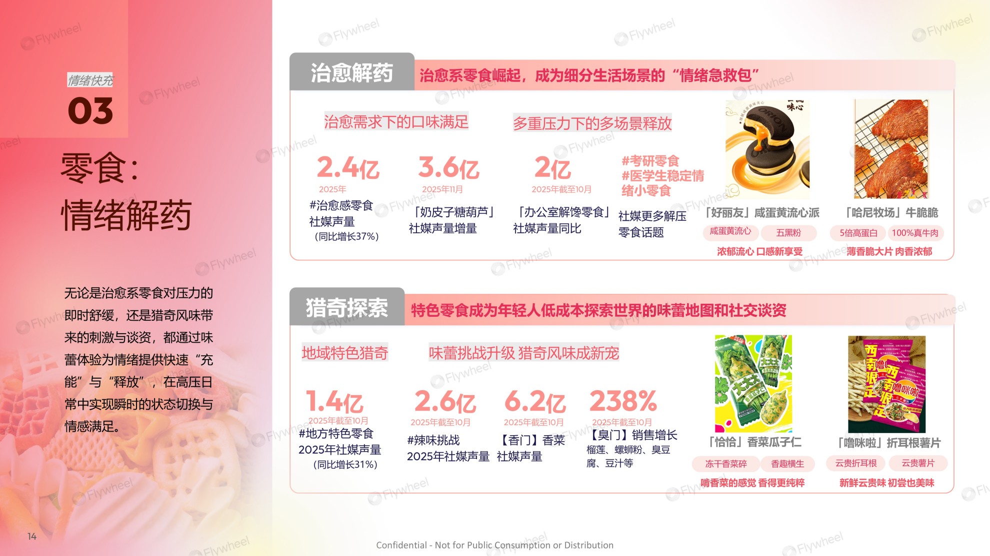 与此同时,年轻人也借“猎奇”探索释放压力、获取社交谈资,#地方特色零食声量达1.4亿,年增长31%,而#辣味挑战、#香门香菜与#臭门榴莲、螺蛳粉等风味挑战类内容声量更分别高达2.6亿与6.2亿,相关品类销售额同比激增238%。无论是寻求稳定安抚,还是主动追寻感官刺激,零食都已成为当代人平衡情绪、表达自我的重要载体。