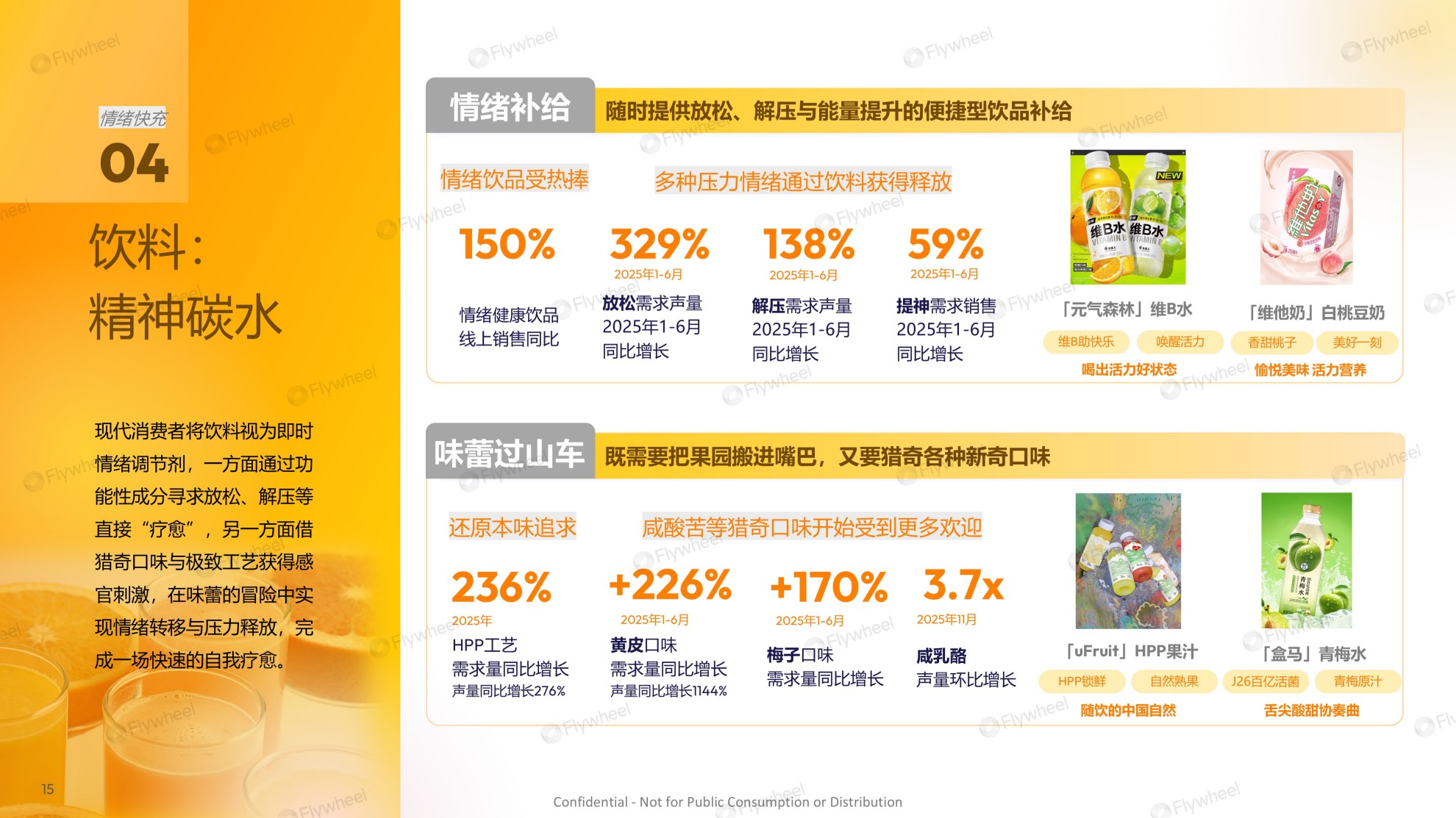 数据印证了这一趋势:一方面,以“放松、解压、提神”为核心的情绪补给饮品快速增长,另一方面,以HPP工艺为代表的创新工艺,与黄皮、梅子等新奇口味的需求量也呈倍数级增长。消费者既要“疗愈”,通过功能性成分获得稳定、安心的支持;也要“刺激”,借由风味探索激活感官,获取即时的快乐与新鲜谈资。