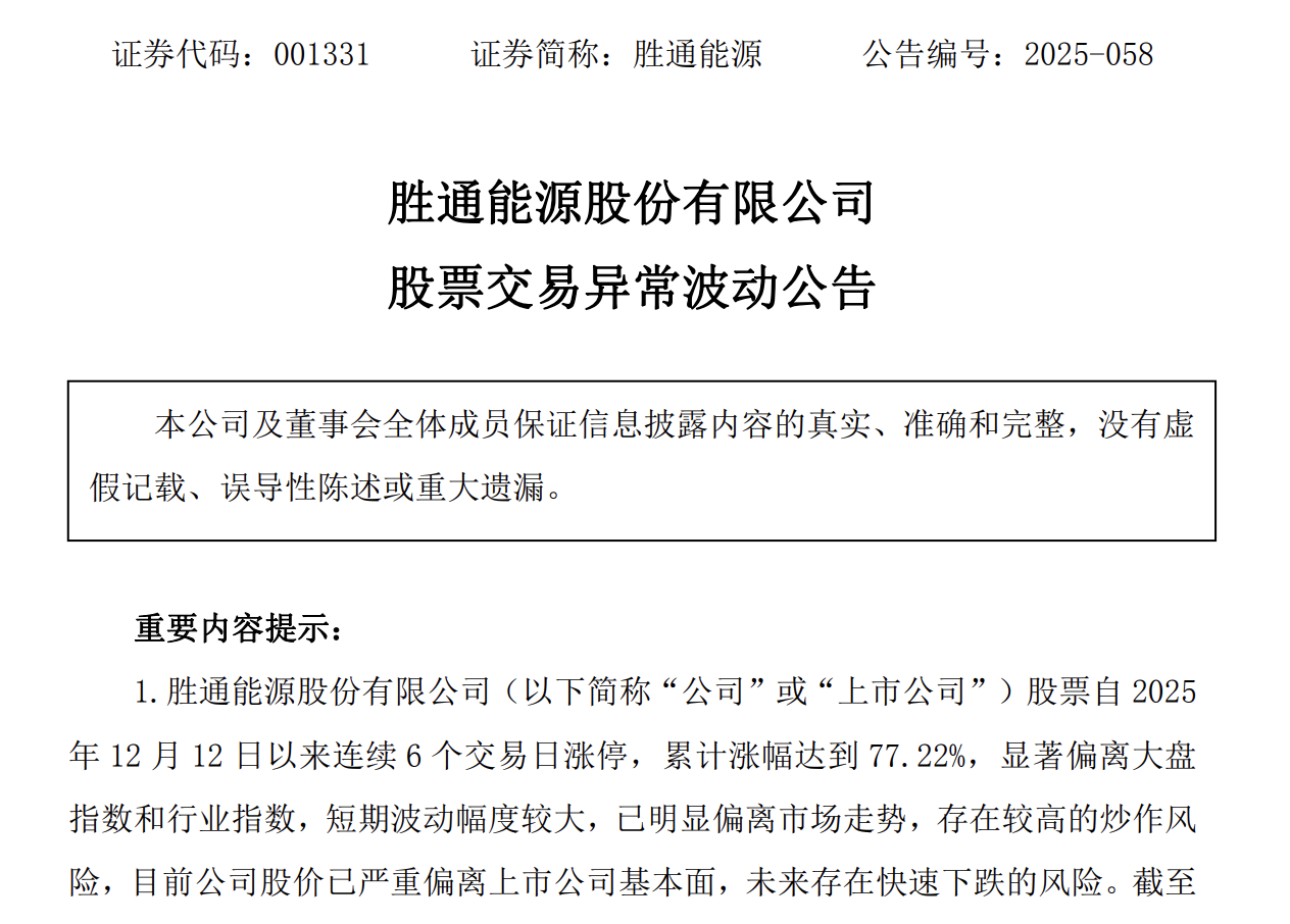 2025年12月21日下午,胜通能源股份有限公司(001331)发布股票交易异常波动公告,明确指出公司股价已严重偏离基本面,并提示未来存在快速下跌的风险。根据该公告,截至12月19日,其股票自复牌后已连续6个交易日涨停。