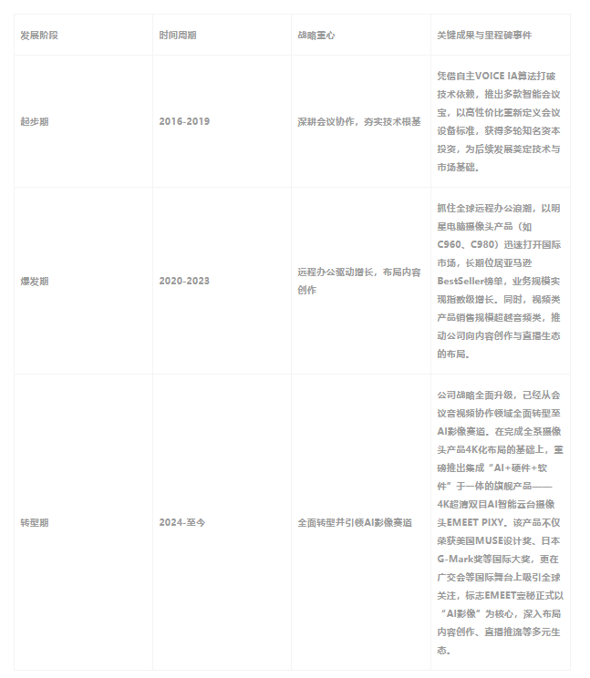 作为专注AI影像的国家高新技术企业,EMEET壹秘发展路径清晰展现中国科技品牌的全球竞争力。其成长历程可分为三大阶段: