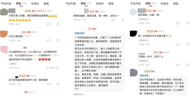 据主创团队介绍,在该有声剧制作过程中其还邀请听众参与试听,收集听众反馈后,对音效配比、台词节奏等细节进行反复优化,在稳步提升作品品质的同时,使作品更加贴合大众审美。目前,该有声剧在喜马拉雅App中的用户推荐值高达91%。许多听众在专辑评论区表示:“这部有声剧堪称年度佳作,不容错过。”“为主创团队打call,大家都好牛!”“至今听过最满意的有声小说,强烈推荐。”