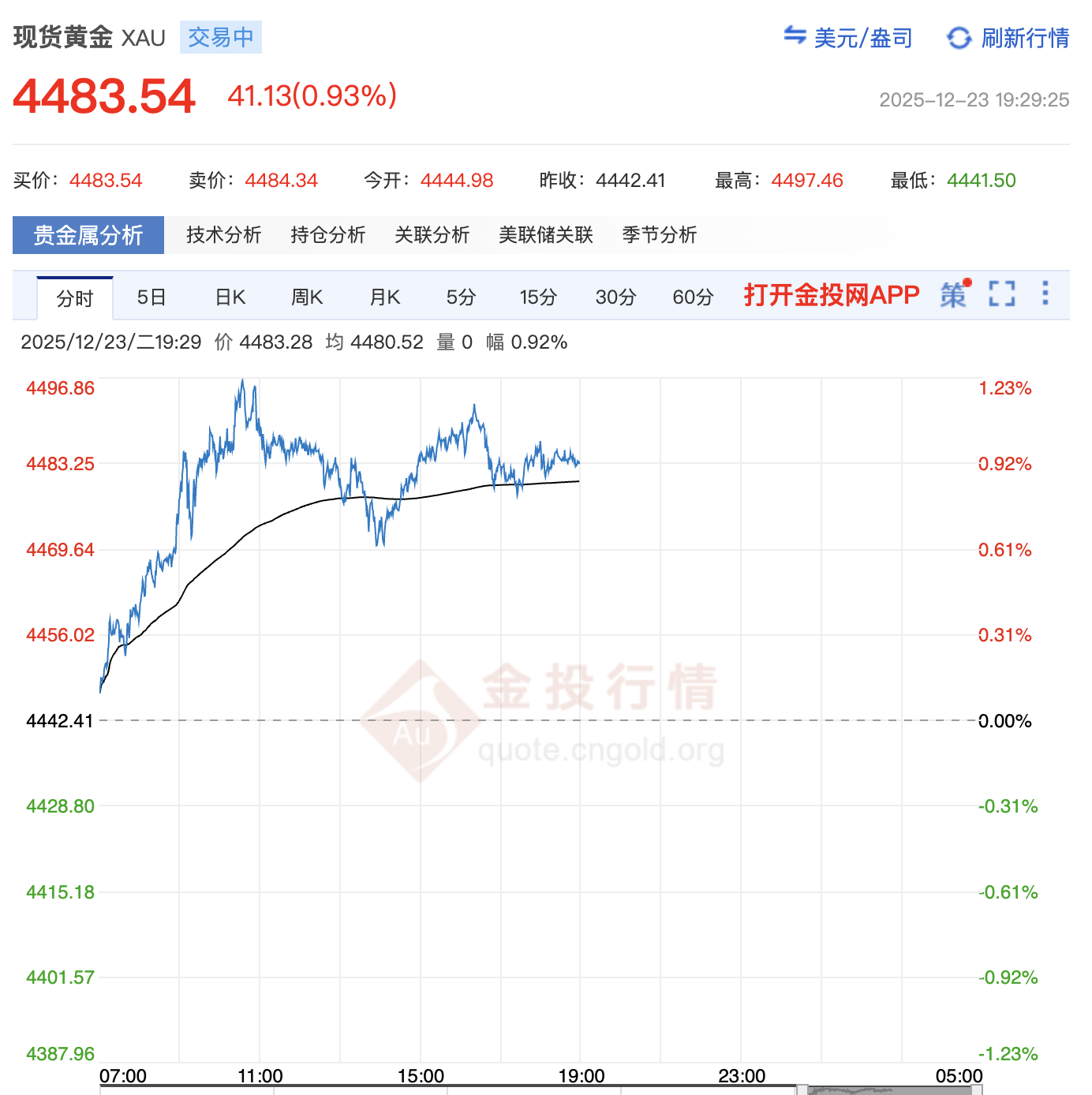 12月23日,现货白银刷新历史新高,突破70美元/盎司,年内涨幅高达142%;黄金价格同步登顶,首次站上4480美元/盎司关口,年内涨幅超70%。与此同时,钯、铂期货一度触及涨停,有色金属板块整体呈现普涨态势。