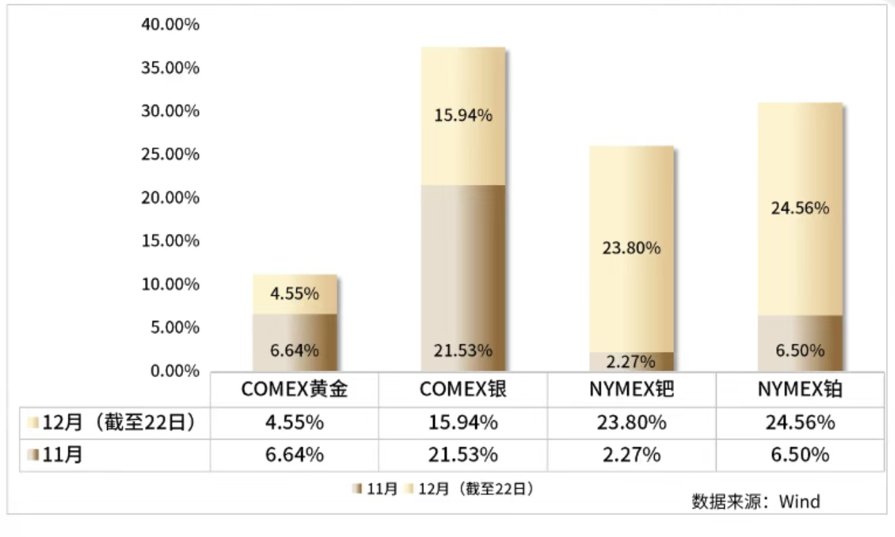 截至12月22日,铂金单月涨幅达24.56%,显著高于11月表现,超过同期黄金与白银,呈现加速上行趋势;钯金单月涨幅也达到23.8%,同样反超金银,跻身当月涨幅最高的贵金属品种。