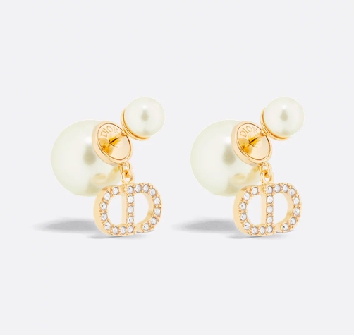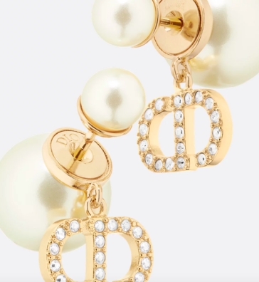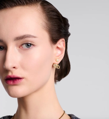 (图注:左:DIOR Tribales耳环整体展示,主珠与CD徽标镶嵌钻石,点缀小珍珠,设计奢华典雅。中:耳环细节展示,金色金属镶嵌双C图案耳钉,背面衬以温润米白珍珠,璀璨晶钻环绕。右:耳环佩戴展示,尽显优雅内敛。)