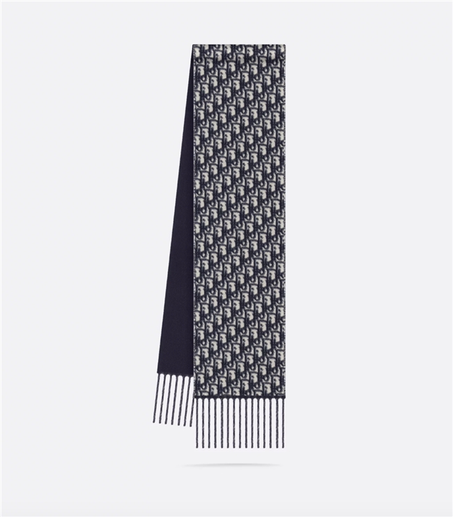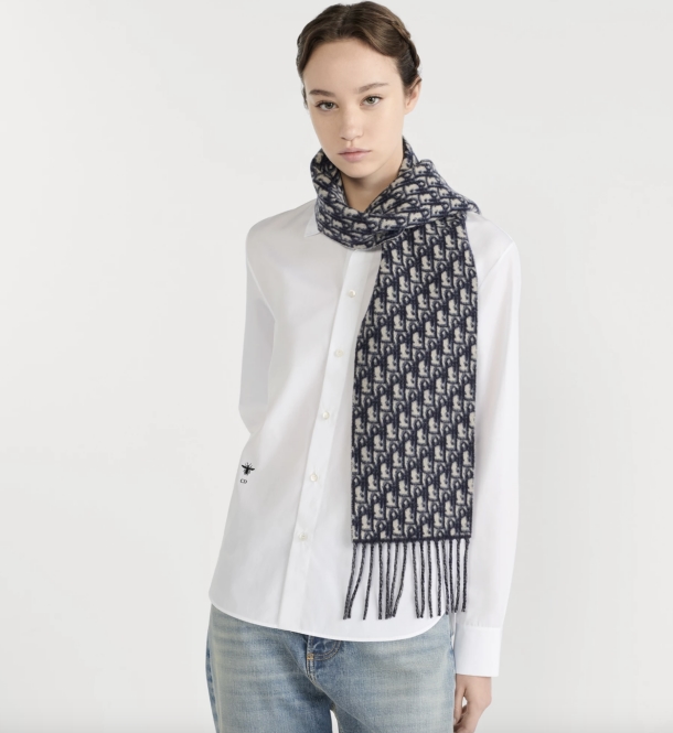 (图注:左:DIOR印花山羊绒围巾整体展示,海军蓝Oblique提花围巾,流苏垂坠,彰显经典优雅格调。右:围巾佩戴展示,造型简约优雅。)