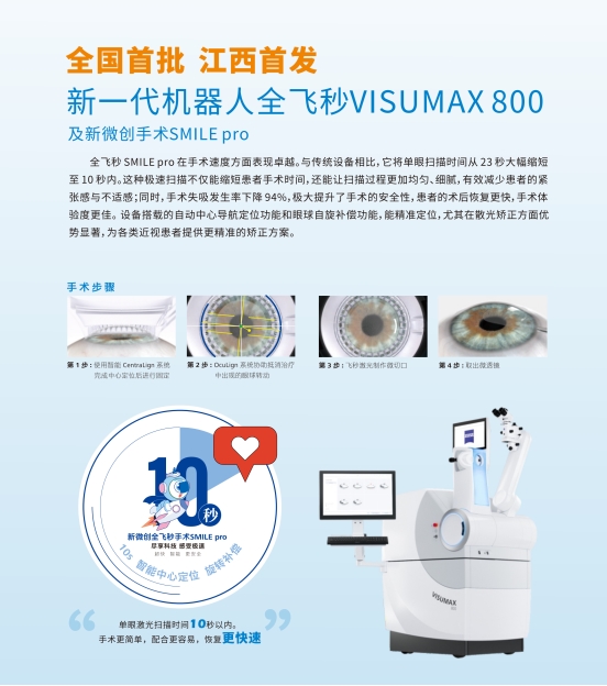 南昌普瑞眼科医院在2025年5月率先引进了德国蔡司新一代机器人全飞秒VISUMAX800及新微创手术SMILEPro,成为全国首批、江西首台引进该设备的眼科医疗机构。
