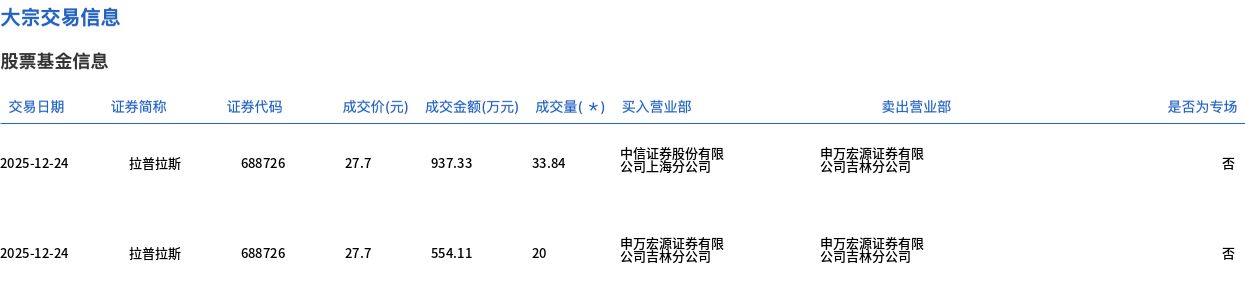 12月24日,拉普拉斯大宗交易成交53.84万股,成交额1491.44万元,占当日总成交额的2.84%,成交价27.7元,较市场收盘价36.58元折价24.28%。