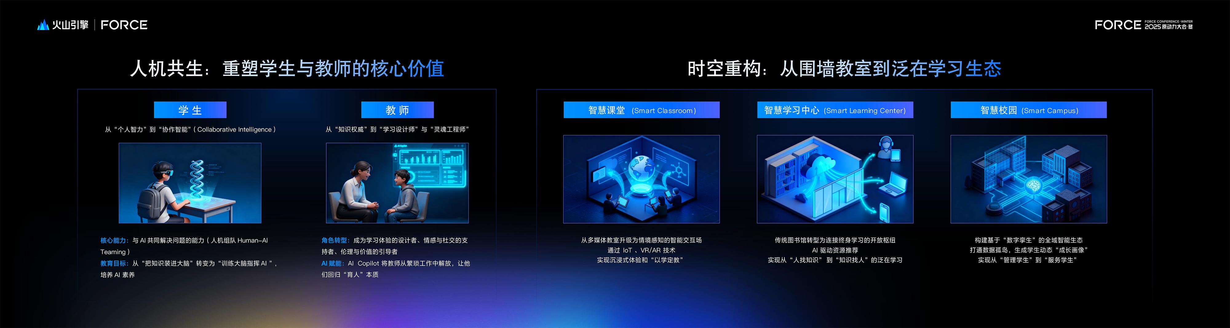 在 AI 帮助下,学生将完成从“个人智力”到“协作智能”的转变,教师的身份也将从“知识权威”转型成为学生的“学习设计师”。火山引擎将通过输出底层算力、大语言模型及全栈工具链,为教育体系的重构提供关键驱动力,打造由未来教师、未来课堂、未来学习中心和未来学校构成的全新教育体系,实现“AI+教育”的深度融合。