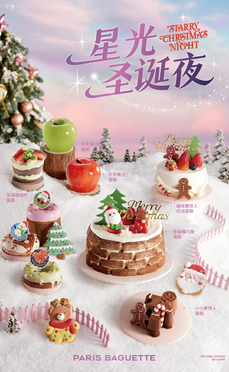 在产品设计上,巴黎贝甜注重风味层次与节日仪式感的结合。例如全新推出的 “星光璀璨圣诞树蛋糕” ,以红丝绒蛋糕为胚体,内层融合开心果与马斯卡彭双重乳酪风味,缀以草莓果酱,口感绵密且层次鲜明。而 “平安果蛋糕” 则巧妙运用苹果酱与酸奶风味奶油,赋予产品清新的酸甜口感与“平安”的美好寓意。