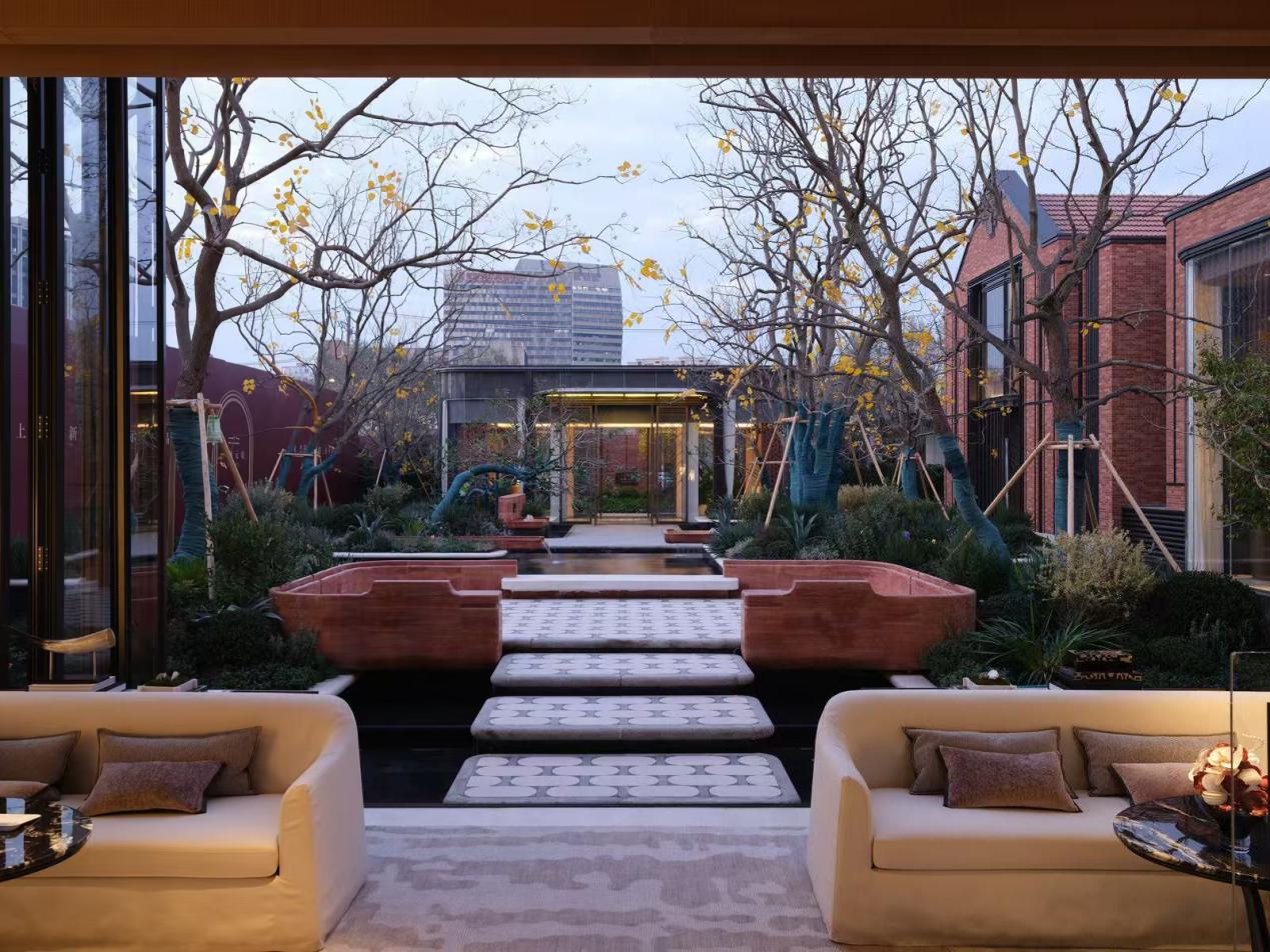 细节打磨上,外立面采用“梅花丁”砌筑红砖墙、马勒别墅风格坡屋顶、邬达克“绿房子”标志性老虎窗,搭配宝格丽酒店同源花岗岩基座与冷弯玻璃幕墙,融合Art Deco铁艺栏杆、和平饭店同款花格砌砖等元素,实现海派经典与现代工艺的无缝衔接。