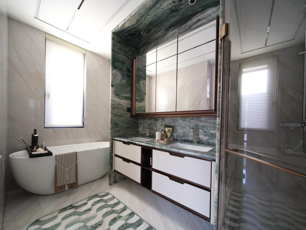 约29平方米的奢适主卧套房,以约3.9米面宽、约7.4米进深远超同面积段常规约17平方米主卧尺度,可从容容纳2米大床、贵妃榻及梳妆台,空间阔绰;配备完整L型衣帽间+梳妆岛台,兼具收纳、梳妆与隐私功能;主卫方正布局、分区明确,含独立浴缸、双台盆与干湿分离设计,兼具隐私性与居住格调。