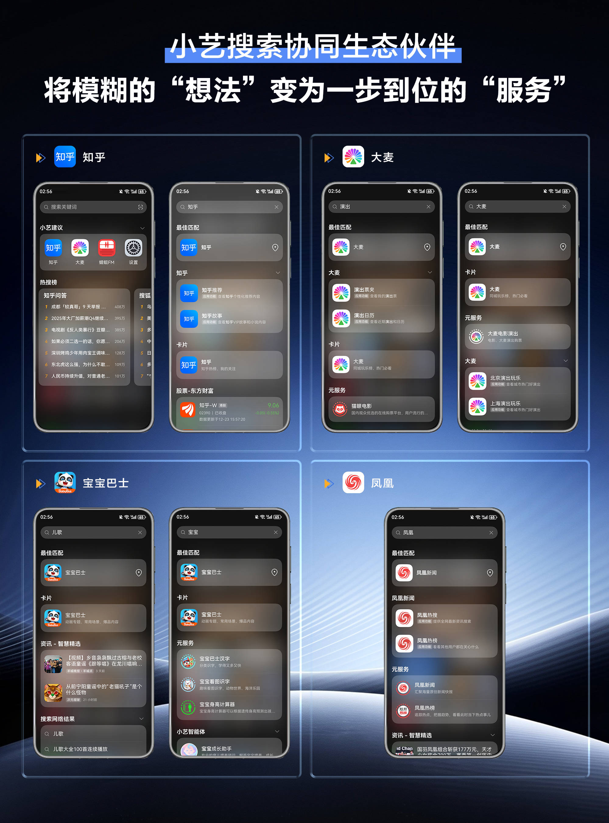 当你手机中装有知乎、大麦、宝宝巴士、凤凰新闻等App,小艺搜索能带来更深度的“搜索即服务”体验: