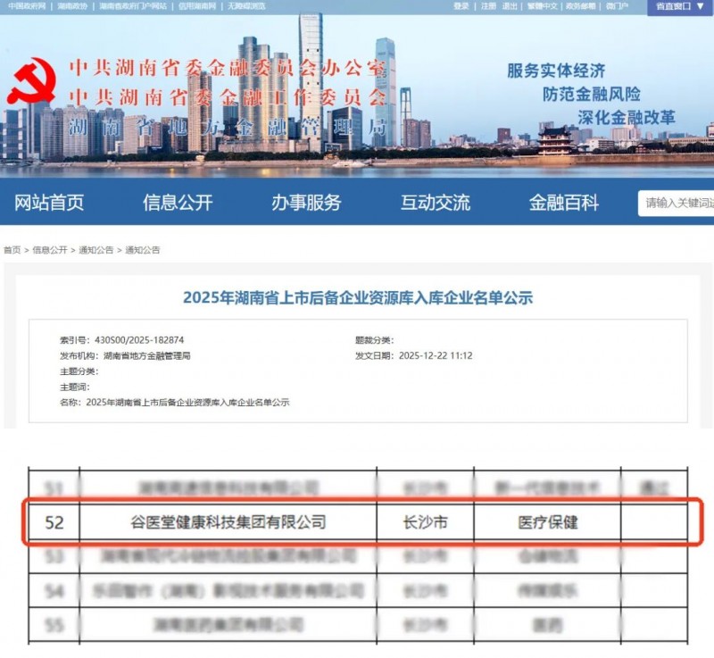 12月22日,中共湖南省委金融委员会办公室发布《2025年湖南省上市后备企业资源库入库企业名单公示》,谷医堂健康科技集团有限公司凭借其卓越的创新能力和稳健的市场表现,成功入库,位列第52位。这是谷医堂自2023年以来,连续第三年入选该省级重要上市后备名单,标志着企业在规范化发展、科技创新与成长潜力等方面持续获得官方高度认可。