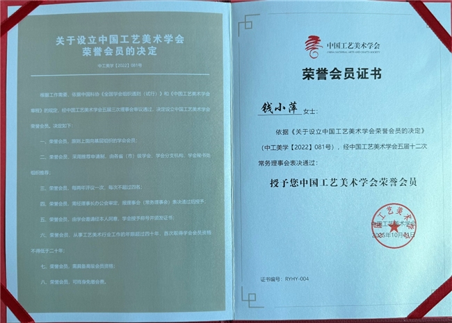 近期,宋锦国家级传承人,中国工艺美术学会织锦专委会会员钱小萍女士获得“中国工艺美术学会荣誉会员”,全国仅两位大师获取此殊荣!钱小萍老师的获奖是中国工艺美术学会对一生奉献在非遗领域与工美领域的每位匠人们的肯定与鼓励,中国工美织锦专委会特向钱老师表示祝贺!
