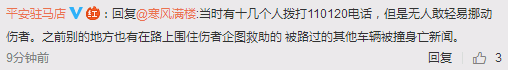 面对网友的“路人太冷漠”质疑声,6月7日,驻马店警方通过官微与网友进行了互动。警方称,涉案司机已被逮捕,赔偿也已到位。针对无人施救问题,驻马店警方官微回复:“当时有十几个人拨打110120电话,但是无人敢轻易挪动伤者。”