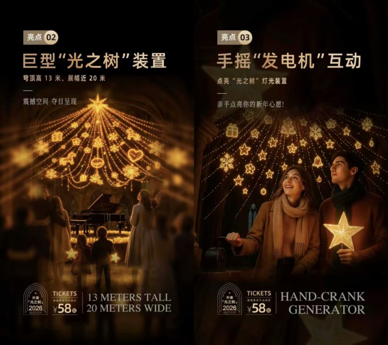 其次,活动主视觉艺术装置为高13米,展幅近20米的巨型“光之树”互动灯光装置。它能随现场古典乐演奏同步变幻,观众还可通过手摇发电机亲手点亮,在独特的“步入式”观演模式中,与新年古典音乐演奏相配合,获得独特而温暖的视听沉浸式新年古典音乐会体验。