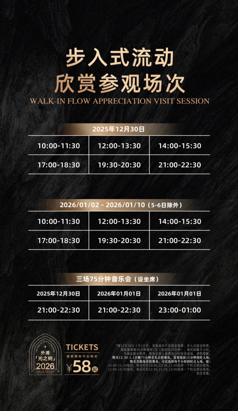 补充:除12月30日、31日和1月1日外,其他场次不设固定座席,观众步入式流动欣赏。部分演出时段为播放背景音乐的光影装置表演,请以现场实际安排为准。