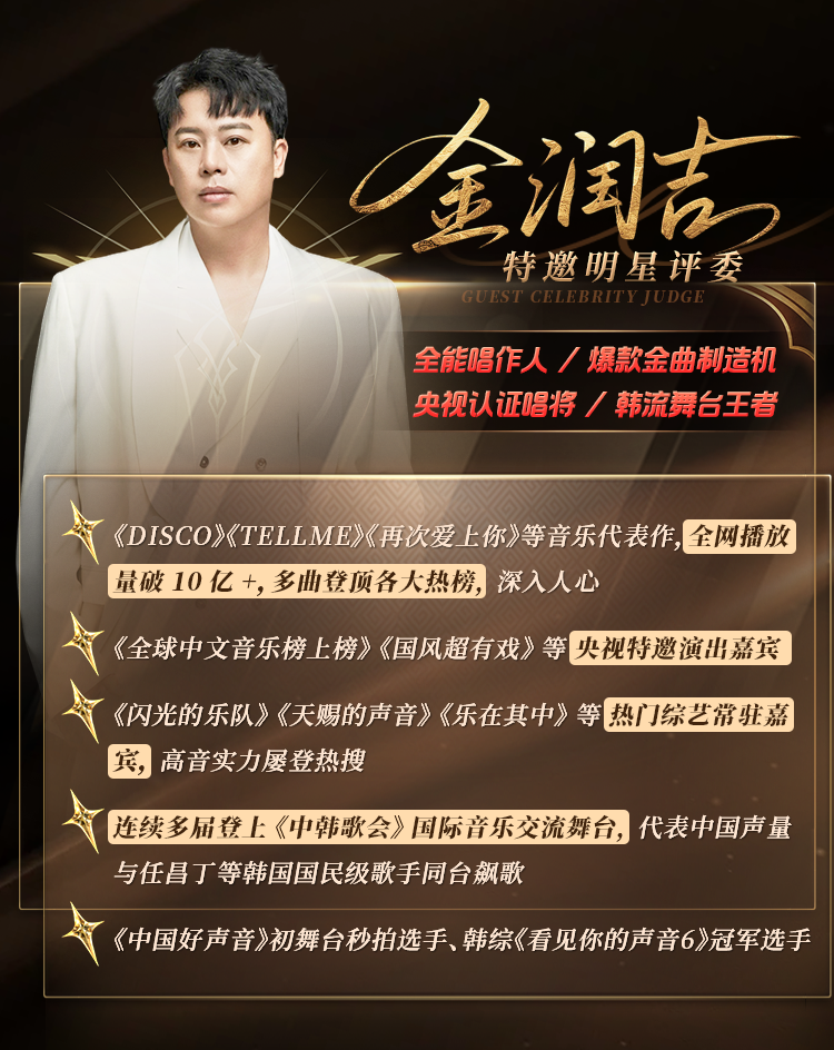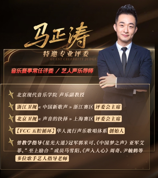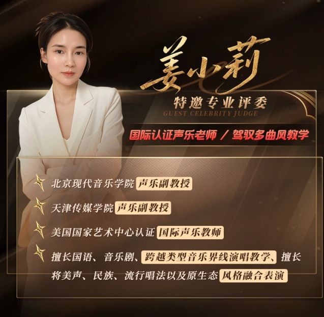 明星评委金润吉作为中国内地流行乐男歌手,凭借深厚的演唱功底和舞台经验,将为选手带来专业指导;专业评委马正涛老师为北京现代音乐学院声乐副教授,深耕声乐教学多年;专业评委姜小莉老师则身兼北京现代音乐学院、天津传媒学院双校声乐副教授,专业实力过硬,三位导师将共同助力总决赛的专业评审工作。