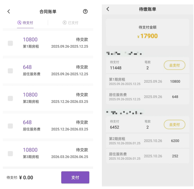 登录相寓APP → 进入合同账单页面 → 选择待缴账单