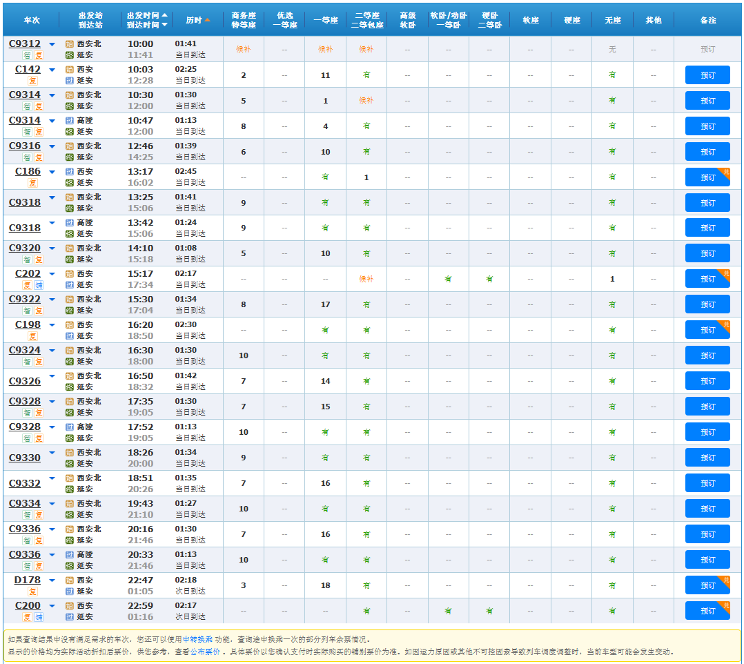 根据中国铁路12306网站显示,C9312、C9309两趟首发列车,于10时分别从西安北站、延安站同步始发。