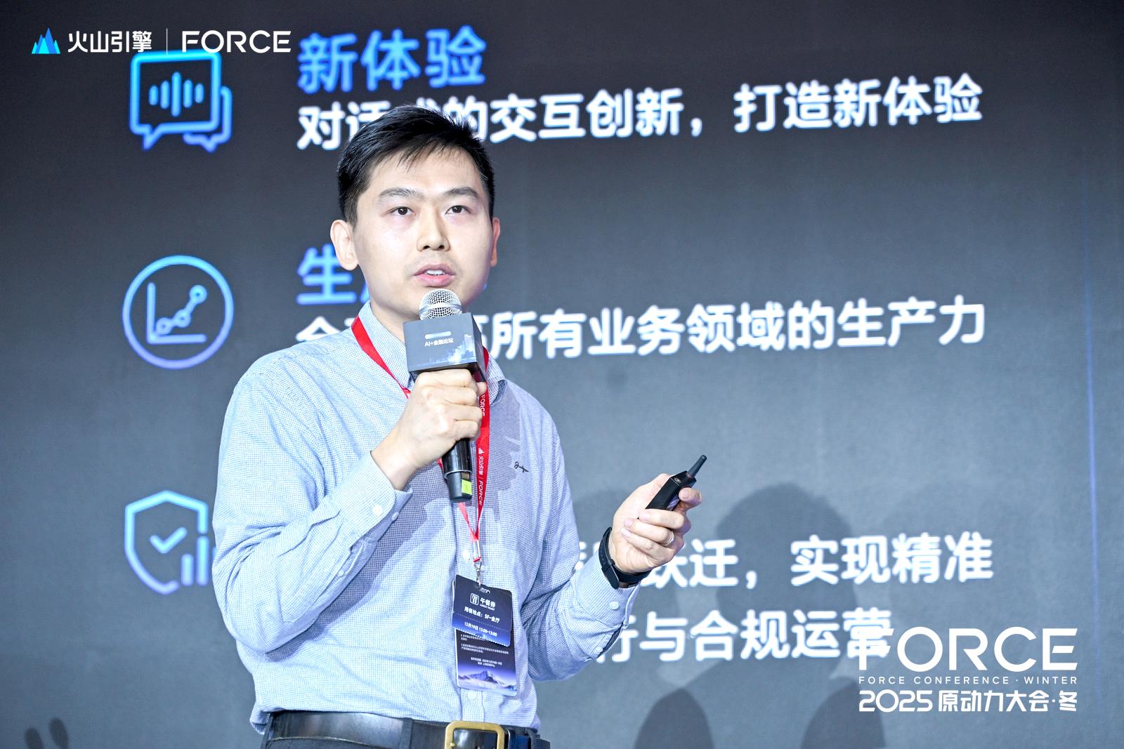 “如果说大模型是为金融业装上了‘超级大脑’,那么智能体就是为这颗大脑配上了执行器,让它动起来,能够感知场景、规划任务和协同执行,成为真正的‘数字员工’。”火山引擎金融方案总经理刘俊在开场演讲中,以生动比喻描述出AI在金融领域的演进脉络。他指出,行业已从 AIGC 爆发、百模竞逐、走向以 “智能体” 为核心的价值创造新阶段。