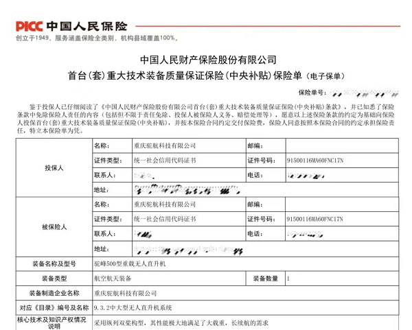 近日,重庆驼航科技有限公司(以下简称“驼航科技”)核心标杆产品——“驼峰”500系列重载无人机,成功签订全国无人机领域首单国家首台(套)重大技术装备保险。
