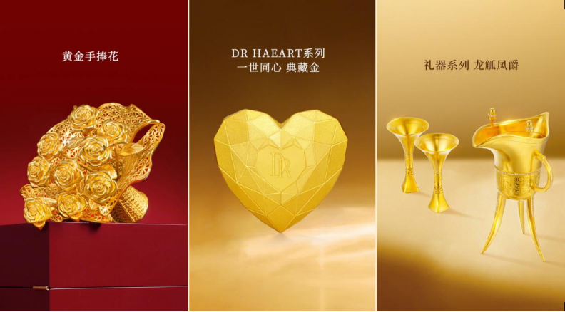 如今中国黄金市场日趋成熟,并正经历从“克重计价”转向“计件定价”,这要求黄金作品必须承载更深层的文化内涵与情感价值,以超越材质本身。热门品牌中,老铺黄金强调中式文化底蕴,琳朝等品牌突出非遗花丝工艺,而DR则选择深耕婚嫁领域。