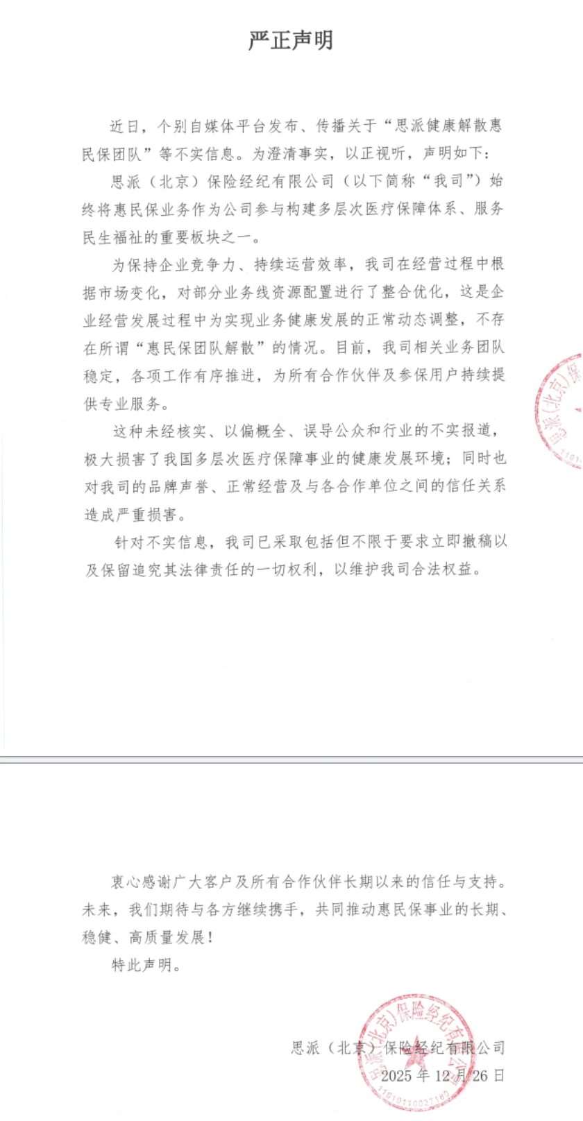 同日,思派健康向界面新闻回应称前述信息不实。思派健康在提供给界面新闻的一份《严正声明》中称,思派(北京)保险经纪有限公司始终将惠民保业务作为公司参与构建多层次医疗保障体系、服务民生福祉的重要板块之一。为保持企业竞争力、持续运营效率,公司在经营过程中根据市场变化,对部分业务线资源配置进行了整合优化,这是企业经营发展过程中为实现业务健康发展的正常动态调整,不存在所谓"惠民保团队解散"的情况。目前,公司相关业务团队稳定,各项工作有序推进,为所有合作伙伴及参保用户持续提供专业服务。(界面新闻记者 陈杨)