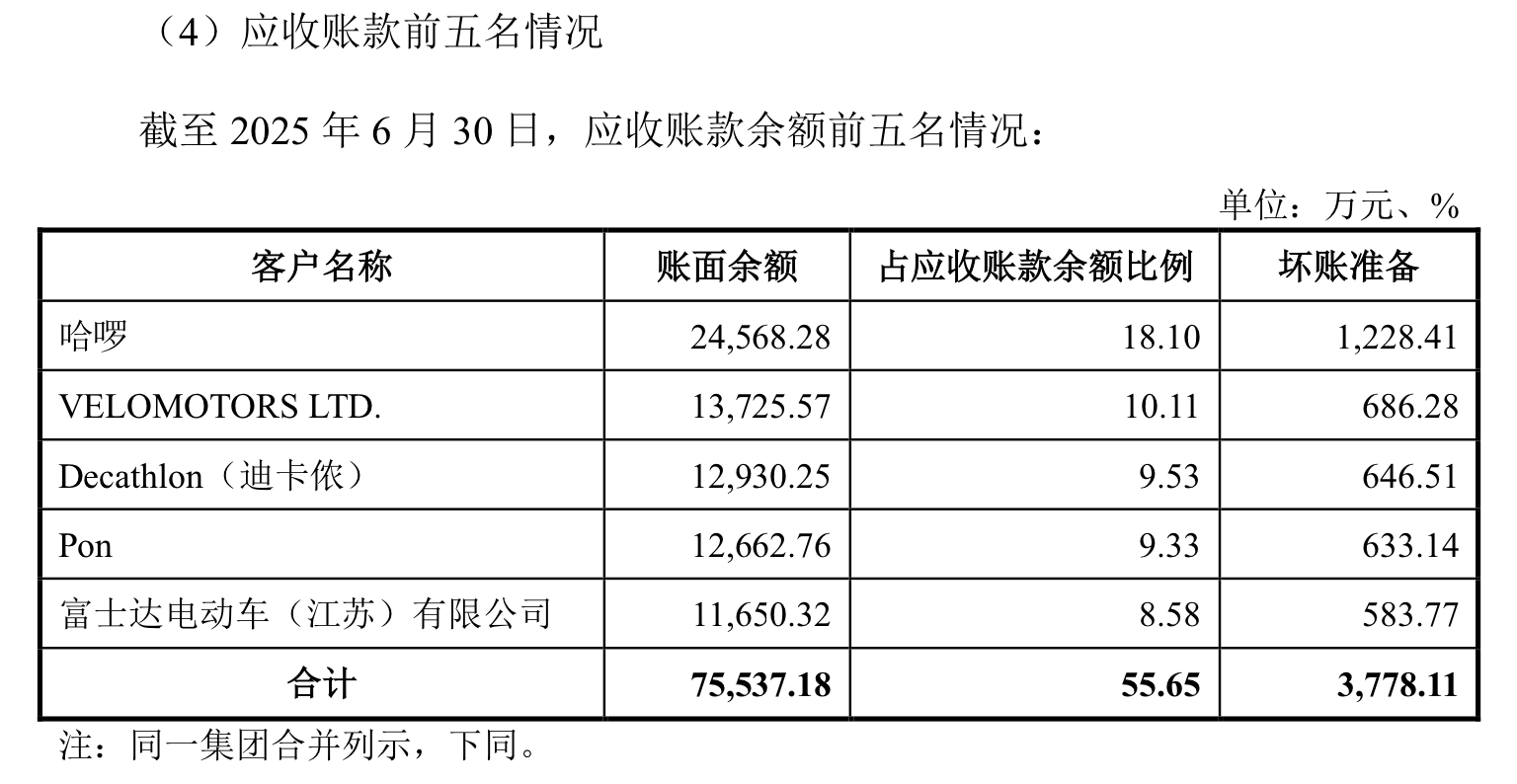 截至2025年6月末,应收账款余额最大的客户是哈啰,账面余额达2.46亿元,占总应收账款的18.1%,相应计提坏账准备1228.41万元。而2025年上半年,哈啰作为公司第二大客户,对应的销售收入为2.84亿元。富士达指出,“目前我国共享单车市场已步入存量竞争阶段”,在毛利率下滑与回款压力并存的存量市场中分羹,公司正面临严峻考验。