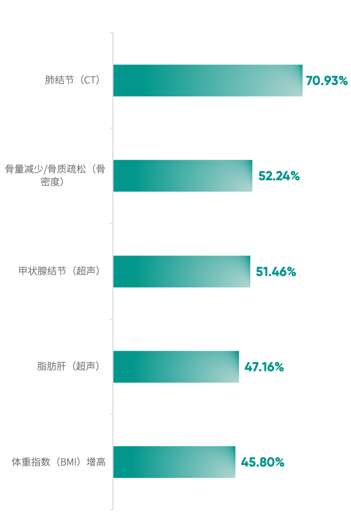 排除与性别相关的项目后,上海市体检人群中检出率排名前五的异常依次是:肺结节(CT)、骨量减少/骨质疏松(骨密度)、甲状腺结节(超声)、脂肪肝(超声)及体重指数(BMI)增高。