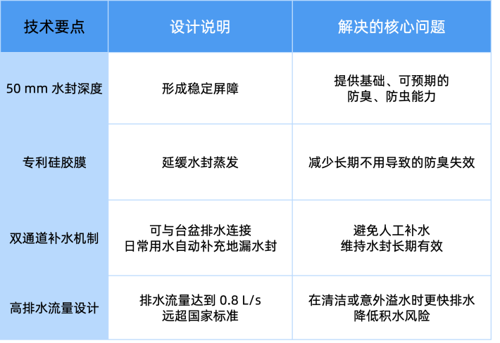 (1)50mm标准水封:严格遵循国家标准,通过稳定水屏障有效隔绝臭气、病菌与飞虫进入室内;