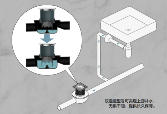 (3)双通道补水机制:吉博力水母芯地漏的双通道型号可以和台盆连接,日常洗手、洗脸时,废水即可自动为地漏水封补水,这样一来,不用定时手动补水也能避免水封干涸,实现长效防臭。