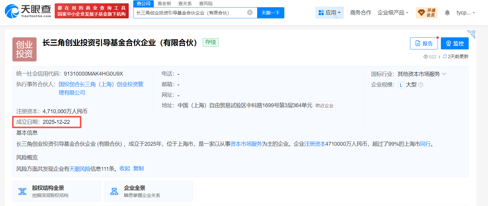 12月22日,长三角创业投资引导基金合伙企业(有限合伙)(简称“长三角创投基金”)成立。据天眼查APP显示,该企业由国投创合长三角(上海)创业投资管理有限公司(简称“国投创合”)担任执行事务合伙人(GP),长三角9家国资企业和央企国投集团、国家创业投资引导基金有限公司作为核心出资方(LP),形成国家级LP支撑,省、市级LP协同的跨区域联动格局。