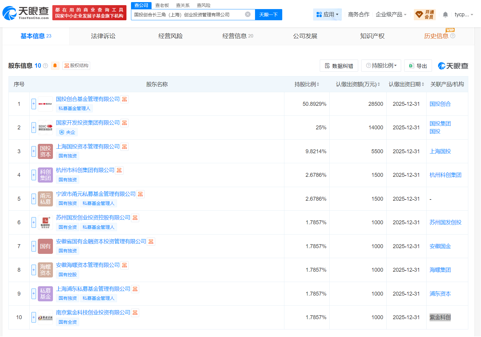 长三角创投基金的设立源自国家层面设立的“航母级”国家创业投资引导基金,这意味着长三角的科技创新已被纳入国家顶层设计,其发展将获得最高级别的资本和政策支持。出资方不仅包括上海、江苏、浙江、安徽的省市级国资(如上海国盛、安徽成果转化基金、杭高投、苏州国发创投等)还包括了央企(国投集团)和产业龙头(海螺集团),这种“中央+地方+产业”的资本矩阵,远超一般地方性基金的能量。作为基金管理人的“国投创合长三角(上海)创业投资管理有限公司”,据天眼查信息,其成立于2025年12月19日,股权信息显示,该公司有国投创合基金管理有限公司持股50.8929%,另有国投集团(25%)等9家公司共同持股,其背后均是清一色国资背景,且重合度颇高。国投集团、上海国投、浦东资本、苏州国发创投、海螺集团均位列其中,其他出资方还包括国投创合、安徽国金、杭科创、南京紫金科创。